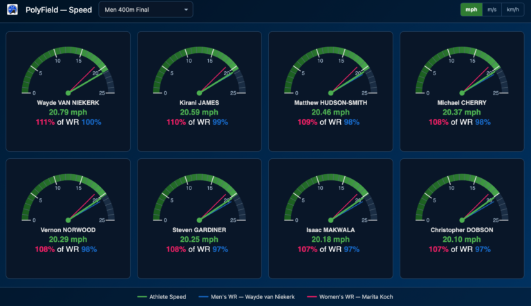 Every race can be viewed as a percentage of World Record (%WR) for Male and Female on a web display. Race speed can be formatted in Miles per Hour, Meters per Second or Kilometres per Hour. Each athletes speedometer displays a comparison of their average race speed to the world record paces.